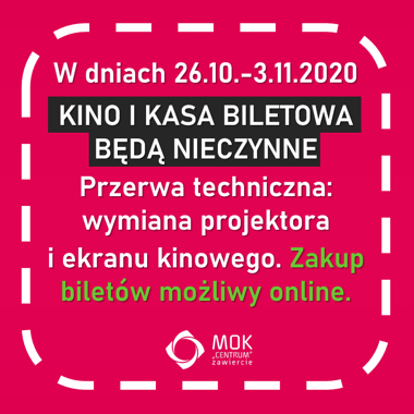 W związku z rozpoczynającymi się pracami związanymi z wymianą naszego sprzętu kinowego, kino i kasa biletowa będą nieczynne. Zmieniamy się dla Was. Wszystko po to, by dbać o standard i komfort korzystania z kina. Wkrótce więcej informacji. Przerwa techniczna potrwa od 26 października do 3 listopada. W tym czasie polecamy szczególnie opcję zakupu biletów online.