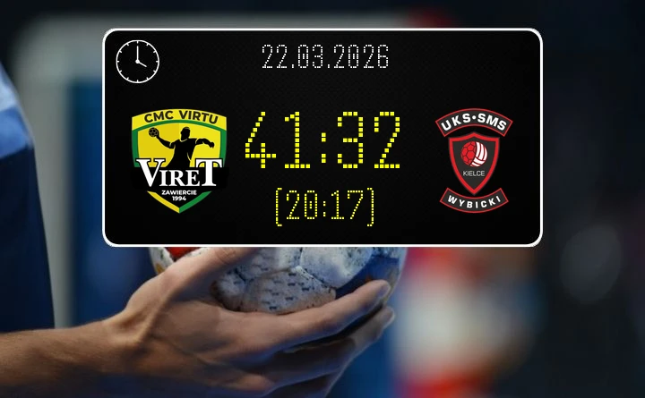 CMC VIRTU VIRET Zawiercie wygrał u siebie z UKS SMS Wybicki Kielce 41:32 w meczu 25. kolejki I Ligi Mężczyzn (Grupa D). W niedzielne popołudnie, 22 marca, gospodarze potwierdzili pozycję lidera tabeli i pokazali, że przy własnej publiczności potrafią narzucić rywalom swoje warunki od pierwszych minut.